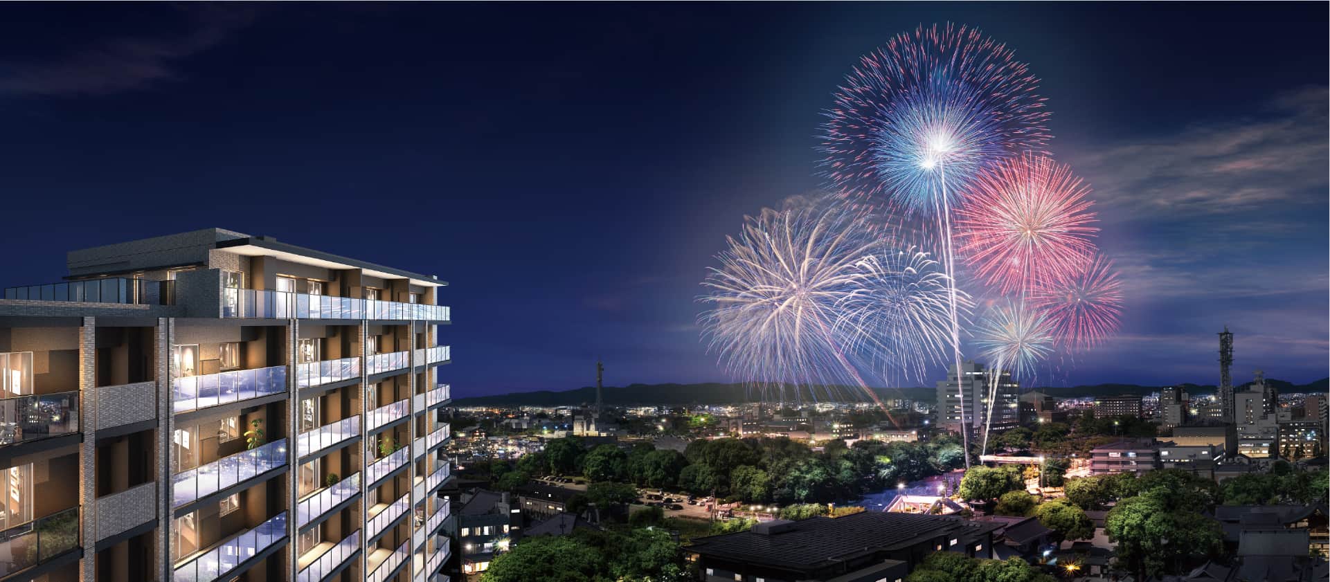 遮るものなき開放の眺望の中、夜空に咲く大輪の花は、